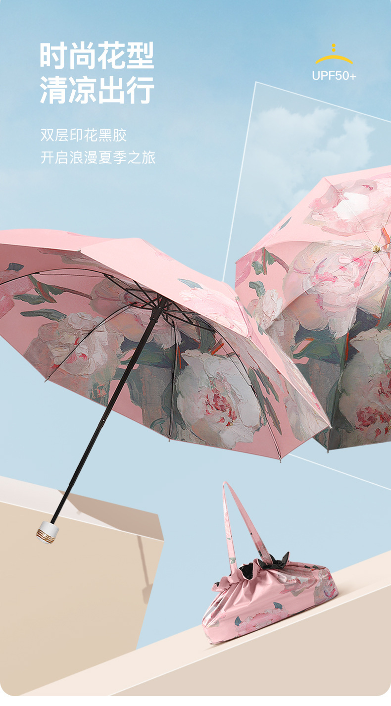 新款手提袋彩胶印花双层伞:伞布材质为黑胶布,过胶为彩胶,密度190T,伞骨材质为铁加纤维,中棒材质为铁,伞柄材质为abs,8骨设计,手动打开和收伞,款式为三折伞。有绿蔷薇,香雪兰,白玫瑰,粉芍药等彩胶花香满园系列,以及黄色、灰绿等流光花语系列可供选择。该伞具有防晒防紫外线功能,毛重370克,造型为双层伞。 |